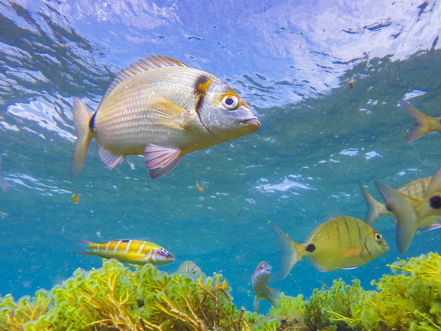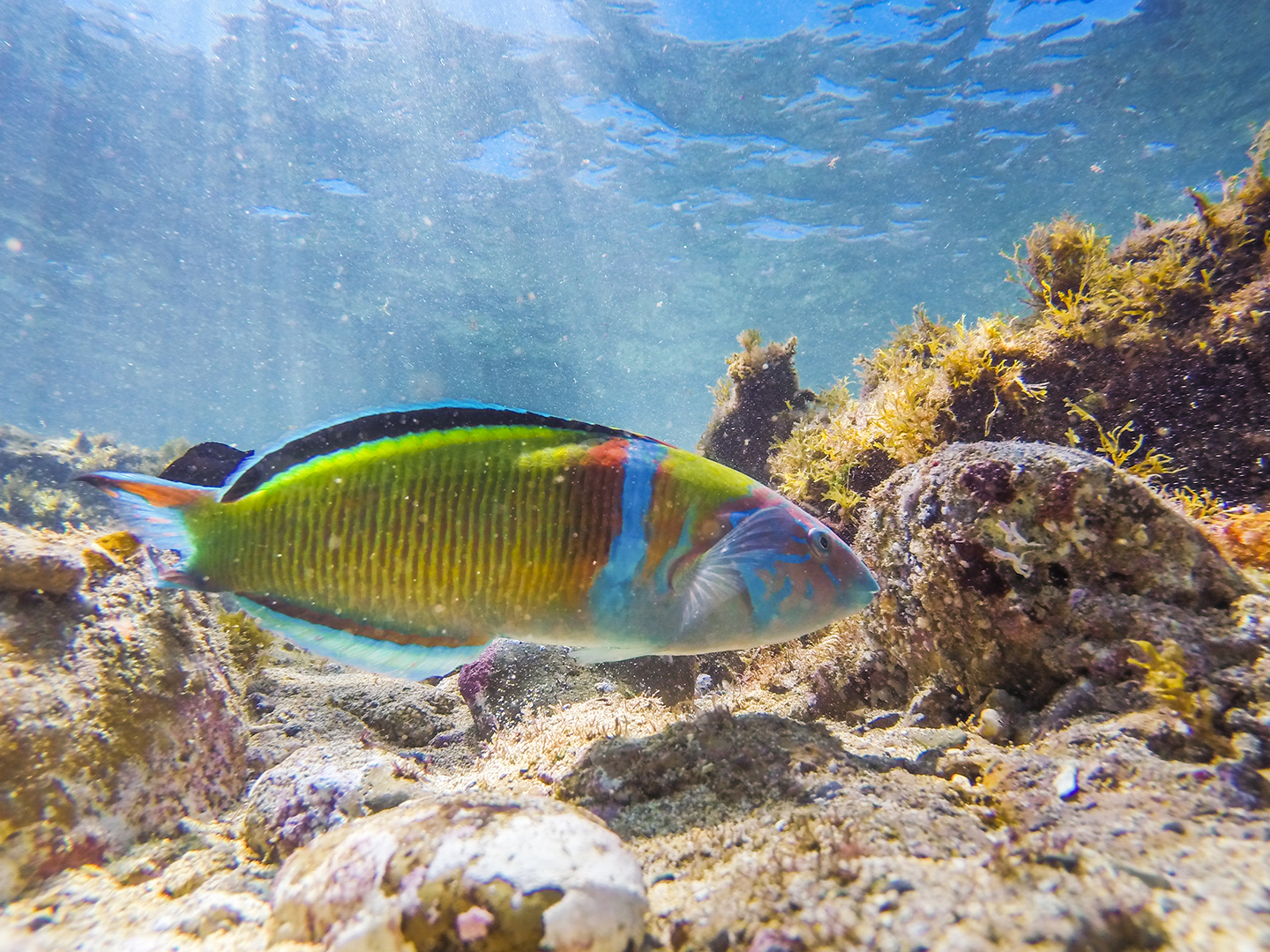 As you'll see from the map below, the best place to snorkel is right in the middle of the beach just south of Playa Chica. The area is sheltered by the reef and is completely calm at low tide. It has a mix of rock, weed, and sand bottoms and attracts a huge variety fish and marine life.